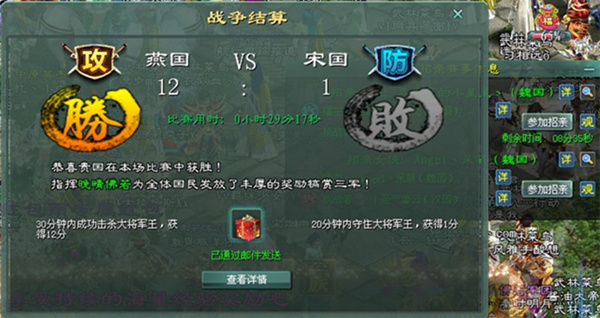 国战,只要肯原地就没有打不下来的NPC,燕国勇士赢得了胜利,宋国的英雄们也很给力,他们用自己的血肉之躯守护大将,为大将军王铸成一道道人墙。此次战役,他们虽败犹荣,因为他们有洒不尽的热血和斗志昂扬的征途魂!