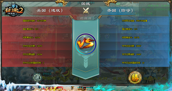 齐国的两次加血已被用掉,为了能给吴国争取更多的希望,吴国的小四爷把两次加时都加满,大将军王的血终于被打到百分之五十五。虽然最终进攻还是失败了,但吴国勇士们在本次国战中的表现非常出色,他们的努力,他们的坚持都让人佩服。相信在未来的比赛中,吴国会越来越有经验,越来越有斗志!
