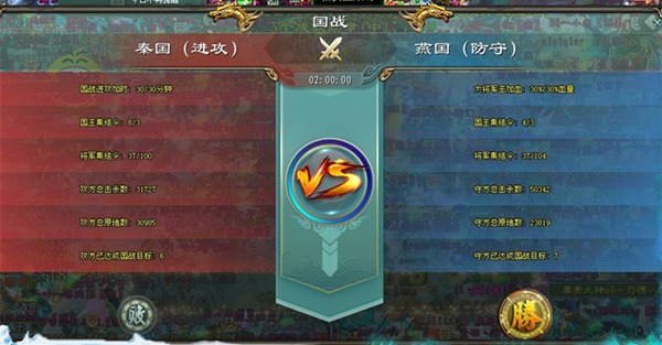 国战进入倒计时,大将血量所剩无几,秦国勇士们还在不停的进攻着,直到最后一秒……国战结束了,虽然秦国勇士没有成功击杀大将,但他们已经创造了奇迹,为秦国带来辉煌的一刻。莫以成败论英雄,此时此刻,秦国和燕国所有兄弟姐妹都是战场上的英雄!