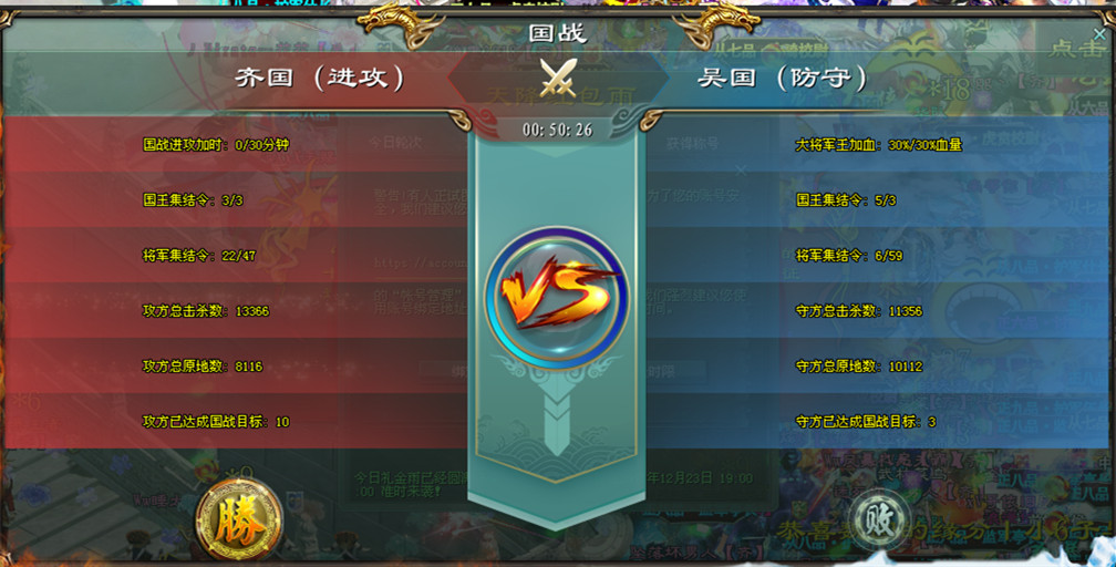 失去了城管的齐国没有放弃,此时国战还有52分钟,吴国的大将军王还有百分之四十的血,吴国的两次加血都用掉了,而齐的两次加时都还在,所以齐国不会放弃,齐国人相信他们一定会取得本次国战的胜利。