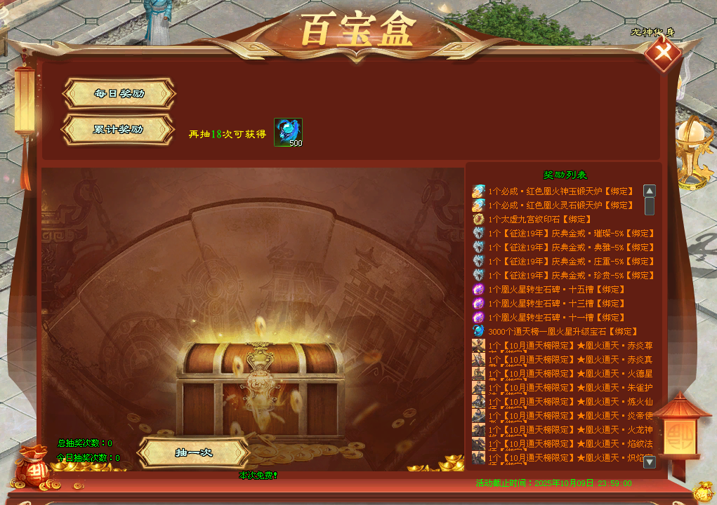 活动期间天天享受周末特权,包括:特别版抽奖、刺探一次必绿、运镖加速、银卡使用上限提升、原地半价、摇钱树获得绑银双倍!系统国运全天开放,系统国探12:00-24:00开放!