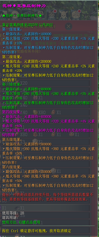 “花神·至尊压制神力”BUFF,最高可获数十万元素固伤加成,攻击至尊压制神力BUFF低于自身的角色时,增加伤害!
