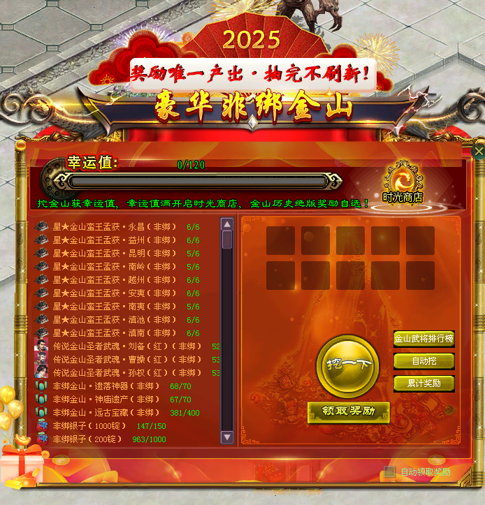 豪华非绑金山,抽完不刷新!可挖出大量非绑银,更有专属限定奖励:金山限定星城池、强力非绑尊者武魂!