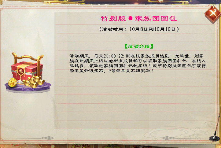 活动期间,每天20:00-22:00在线家族成员达到一定数量,则家族在此期间上线过的所有成员都可领取家族团圆礼包。在线人数越多,领取的家族团圆礼包越高级。