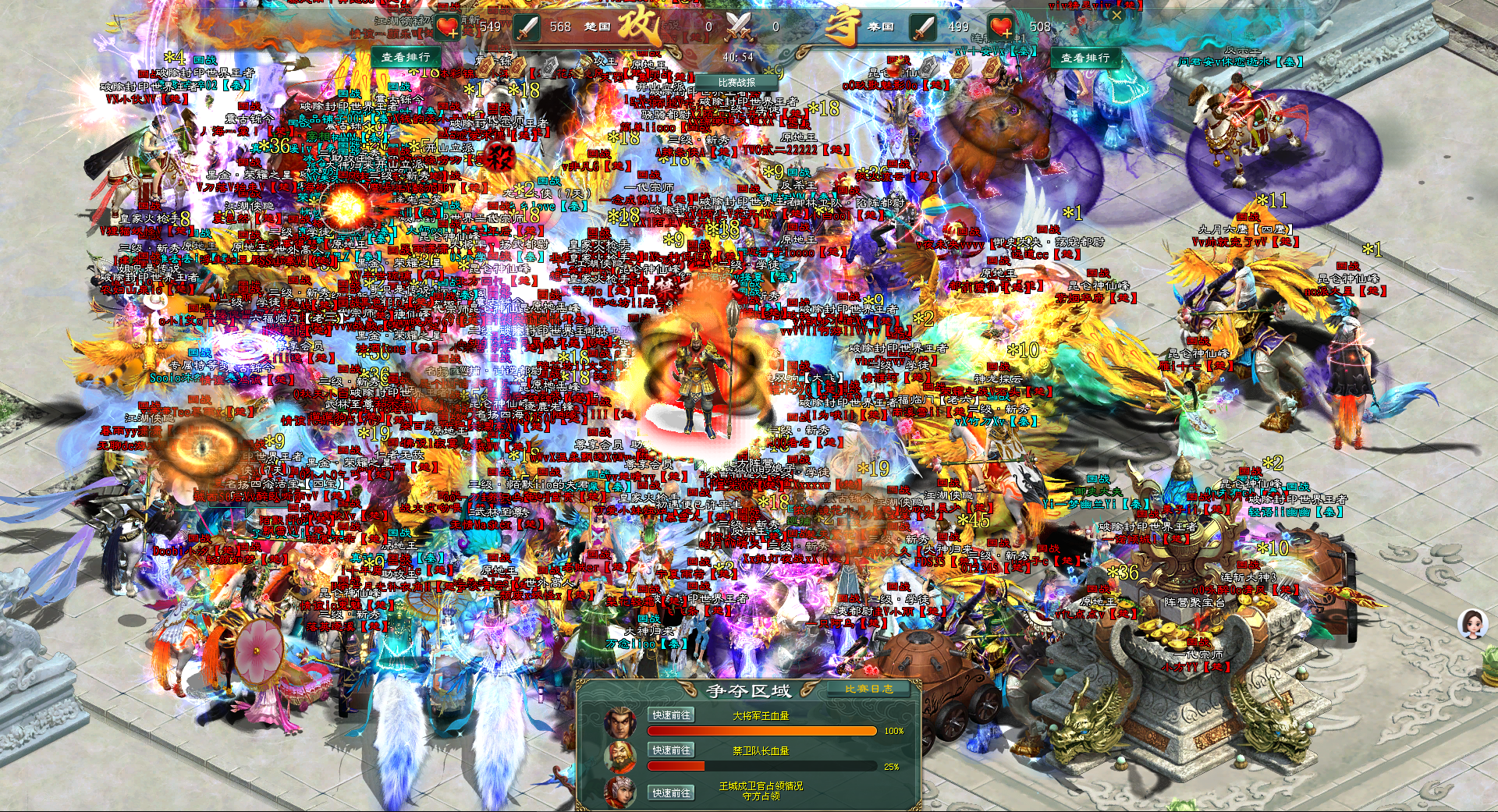 禁卫队长处,作为防守国的南方阵营秦国将士们已等候,当北方阵营楚国将士以空降的方式落地后,并没有着急进攻禁卫队长,而是将手中的武器对准了防守的南方阵营秦国将士,一时间,各种技能与大招齐发。