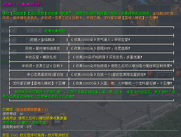 收集5000/20000/50000等指定硕果数量,即可领取全新时装-金临裁决、丰收颂·忠勇之证(强力属性与压制)!最高可领取至龙吟星石碑(雷电火随机)十五槽!