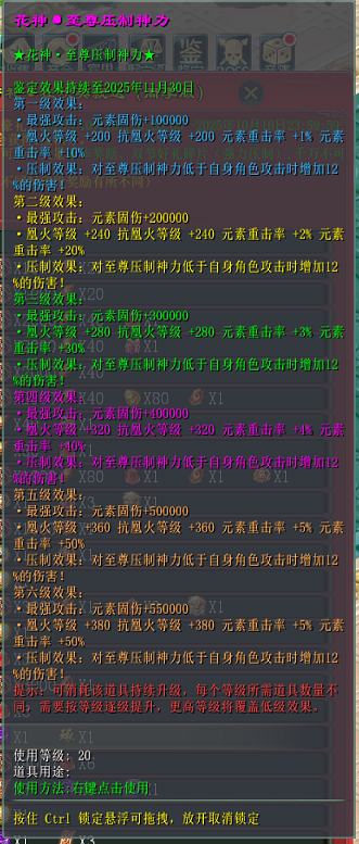 “花神·至尊压制神力”BUFF,最高可获数十万元素固伤加成,攻击至尊压制神力BUFF低于自身的角色时,增加伤害!