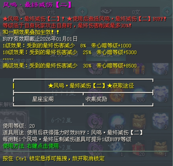 星座宝阁收集新增全新 凤鸣·最终压制减伤【二】,最高30%最终减伤。与一期效果共同生效。