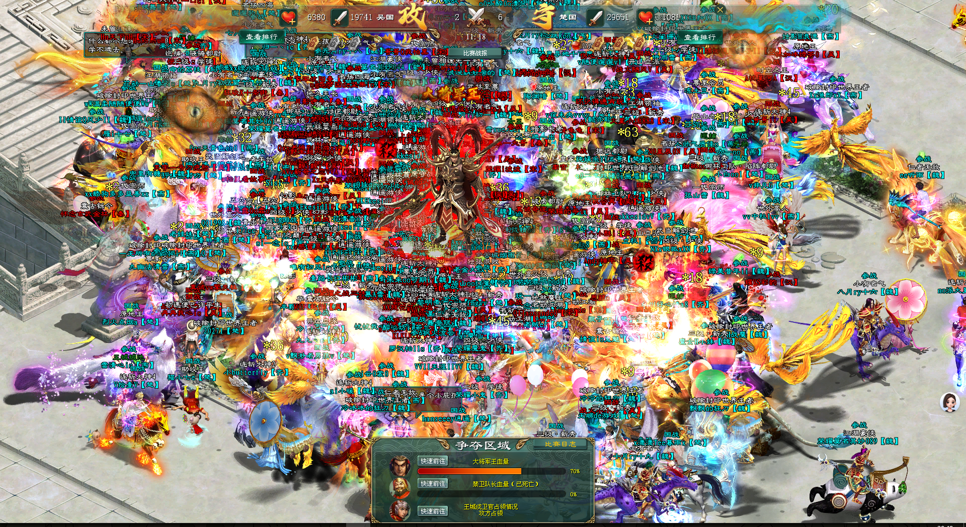 大将军王血量下降,给所有参战南方阵营四国将士带来了希望。所有场上参战的将士完全无视身上受到的各种技能与大招攻击,一心将手中的武器锁定大将军王,不停地施放技能与大招。