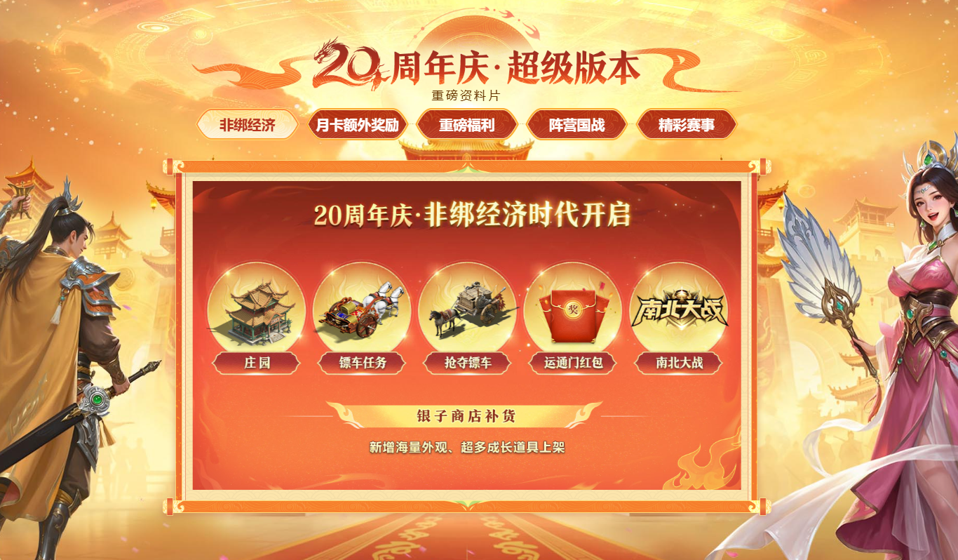 ■超级版本:进入版块查看《征途2》周年庆丰厚福利与赛事——非绑经济赚翻天,银子商店珍品补货,超级黄金聚宝盆多倍嘉奖,系列活动送20周年纪念套装,全区华山论剑大战在即!