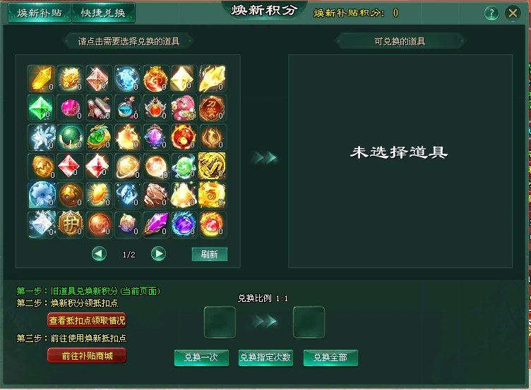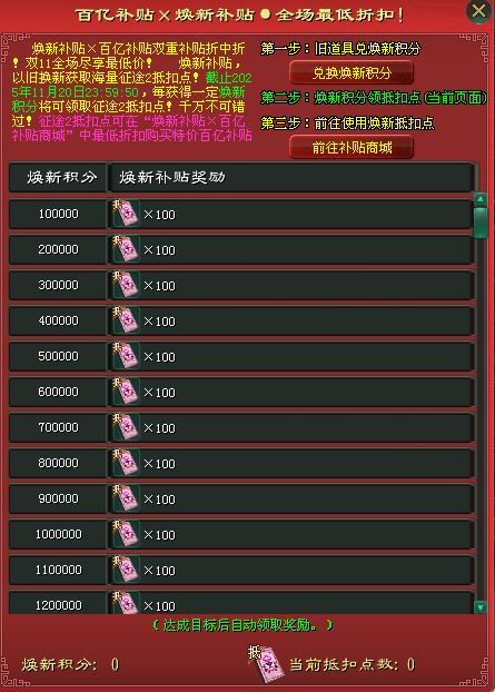 (1)通过【商会-百亿补贴商城-兑换焕新积分】,或【包裹左上角-焕新补贴】打开焕新积分兑换界面,可将拥有的老道具兑换为“焕新补贴积分”;