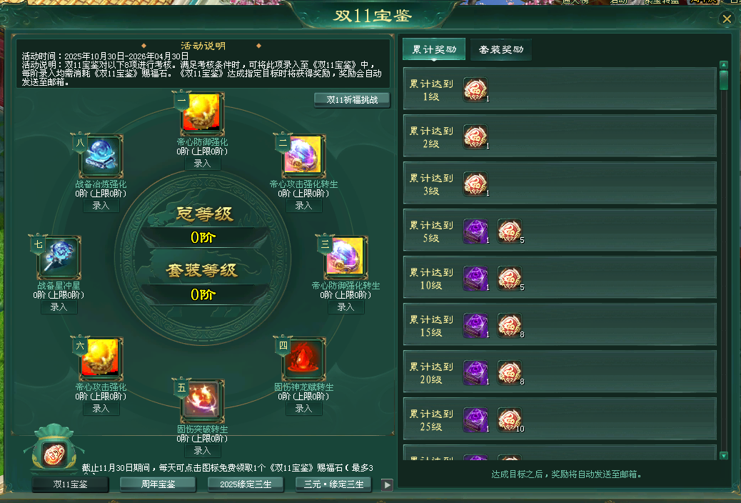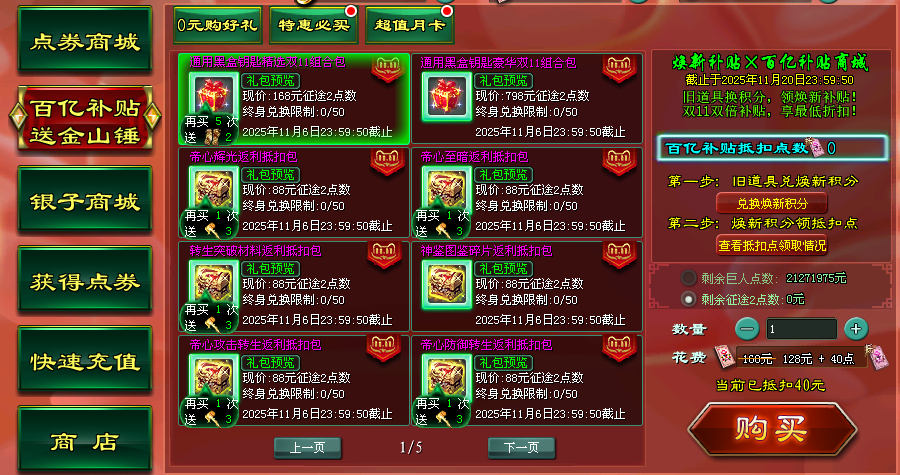 三、双11百亿补贴,老道具换积分、每日登录送,获取“征途2抵扣点”,无需抵用券就是全场最低抵扣!双11祈福挑战,配合周年宝鉴、双11宝鉴,奖励超级加倍,祈福倍率最高可达13.5倍!