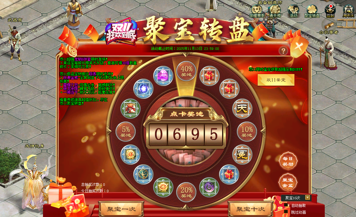 从聚宝转盘中累计获取点卡,还可激活金盆奖励:双11聚宝心愿硬币、双11龙韧套装幸运宝箱以及双11宝鉴赐福石!