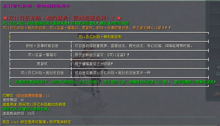 商城开放时间:10月31日-11月20日 23:59(商城内礼包将每周更新)