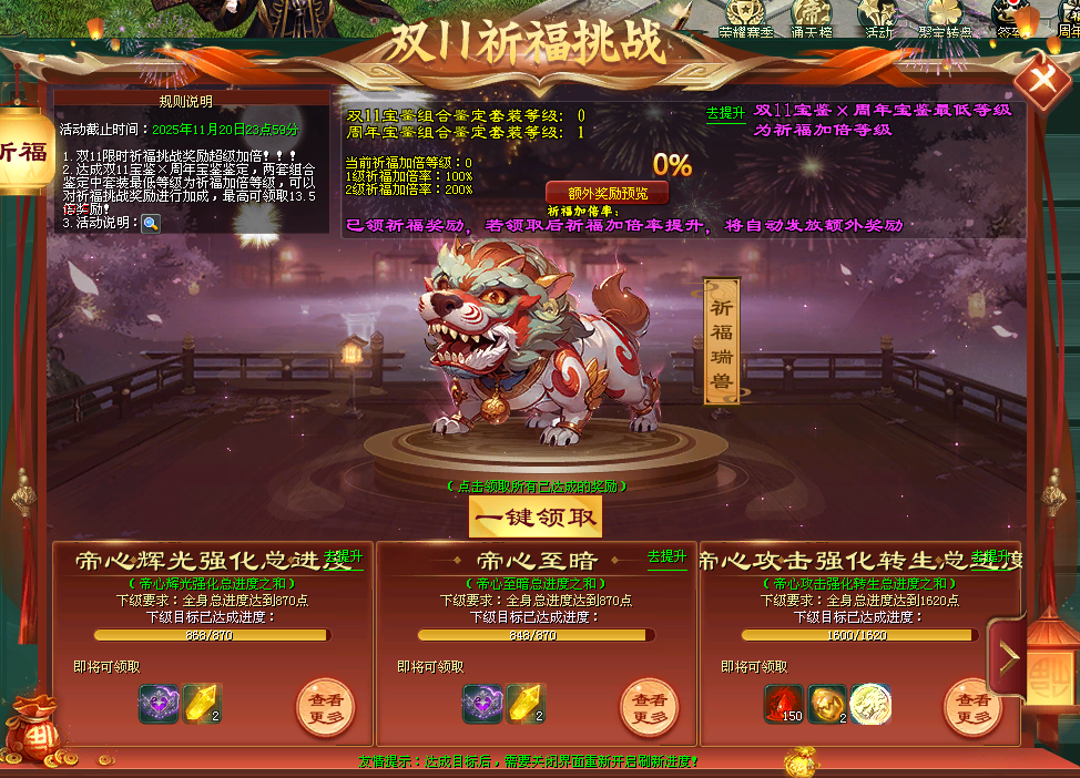 双11祈福挑战,配合周年宝鉴、双11宝鉴,奖励超级加倍,祈福倍率最高可达13.5倍!十五星帝王星,十五帝王星槽等祈福奖励多倍获取,超多成长线材料和超强时效压制增伤BUFF等你来拿!