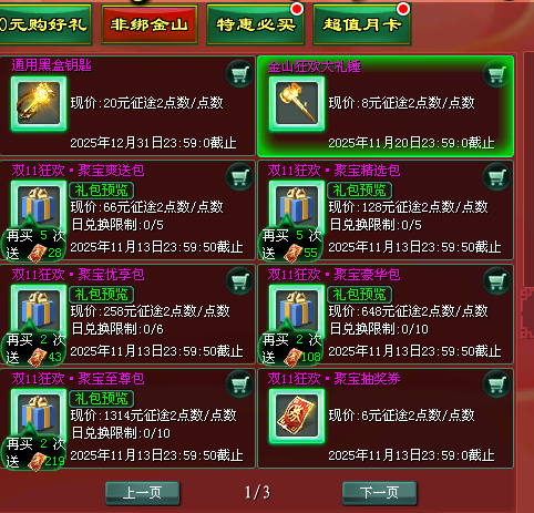 双十一限定豪华非绑金山,奖励内容大幅提升,抽完不刷新!有机会挖出双11专属武魂、神鉴突破精华、非绑银子等海量非绑道具!