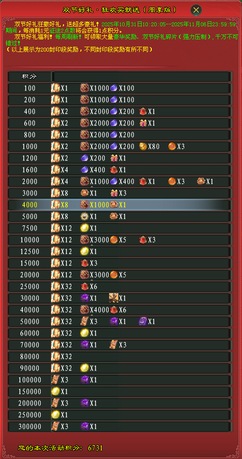 活动时间:10月31日更新后-11月6日