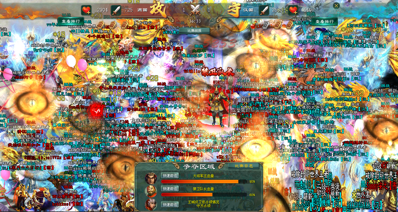 时间一分一秒流逝,国战时间不断减少。大将血量仍有70%,燕国见状再度拉出大令,令之所指,将士们爆发出惊天战力,战场瞬间掀起新的高潮,大将血量终于开始快速下滑。又过去十几分钟,大将血量跌破50%,而此时国战剩余时间已不足一刻钟,燕国将士却依旧奋勇向前,汉国此时给大将加血,把燕国的进攻节奏再度打乱。