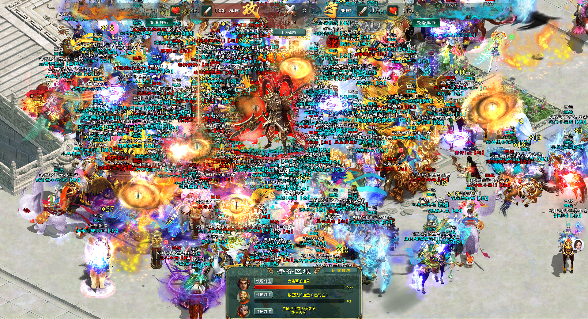 当国战时间已临近结束,此时,大将军王的血量只掉了一半,为了能有机会攻掉大将军王,北方阵营赵国使用了加时,随后,南方阵营的加血也被使用上。