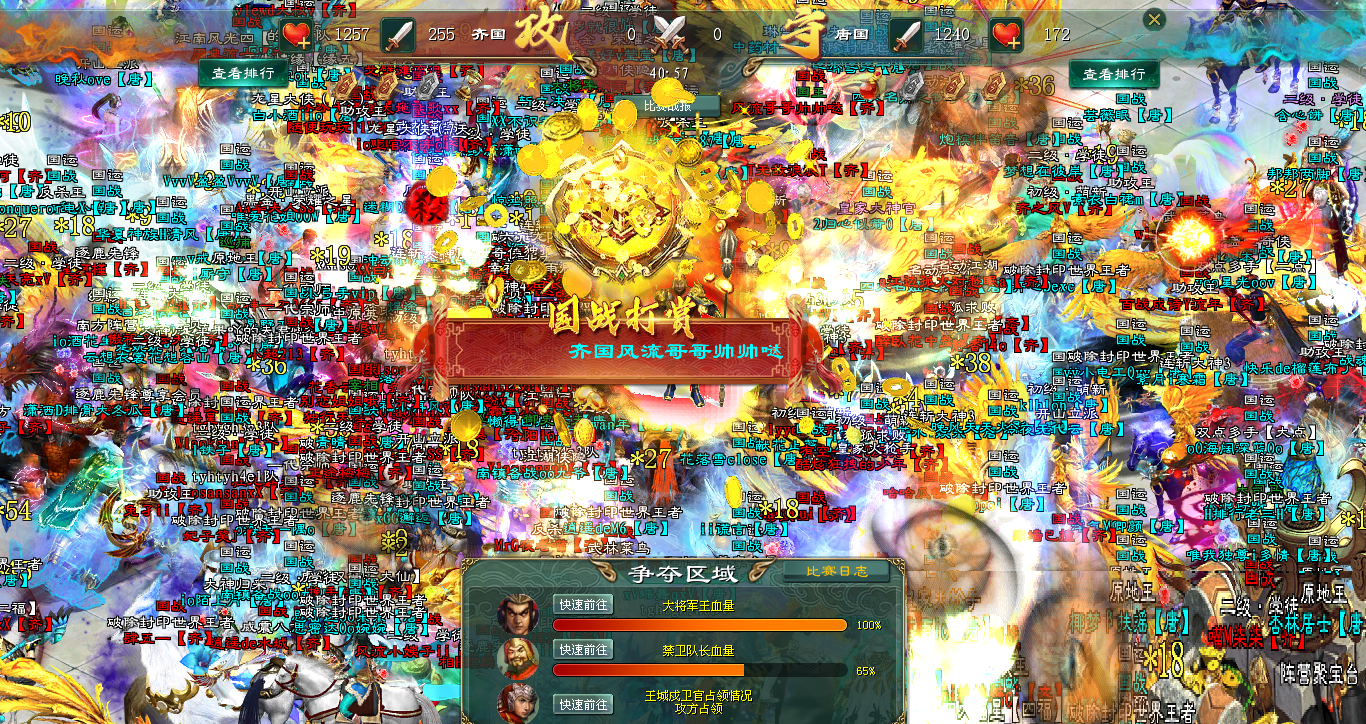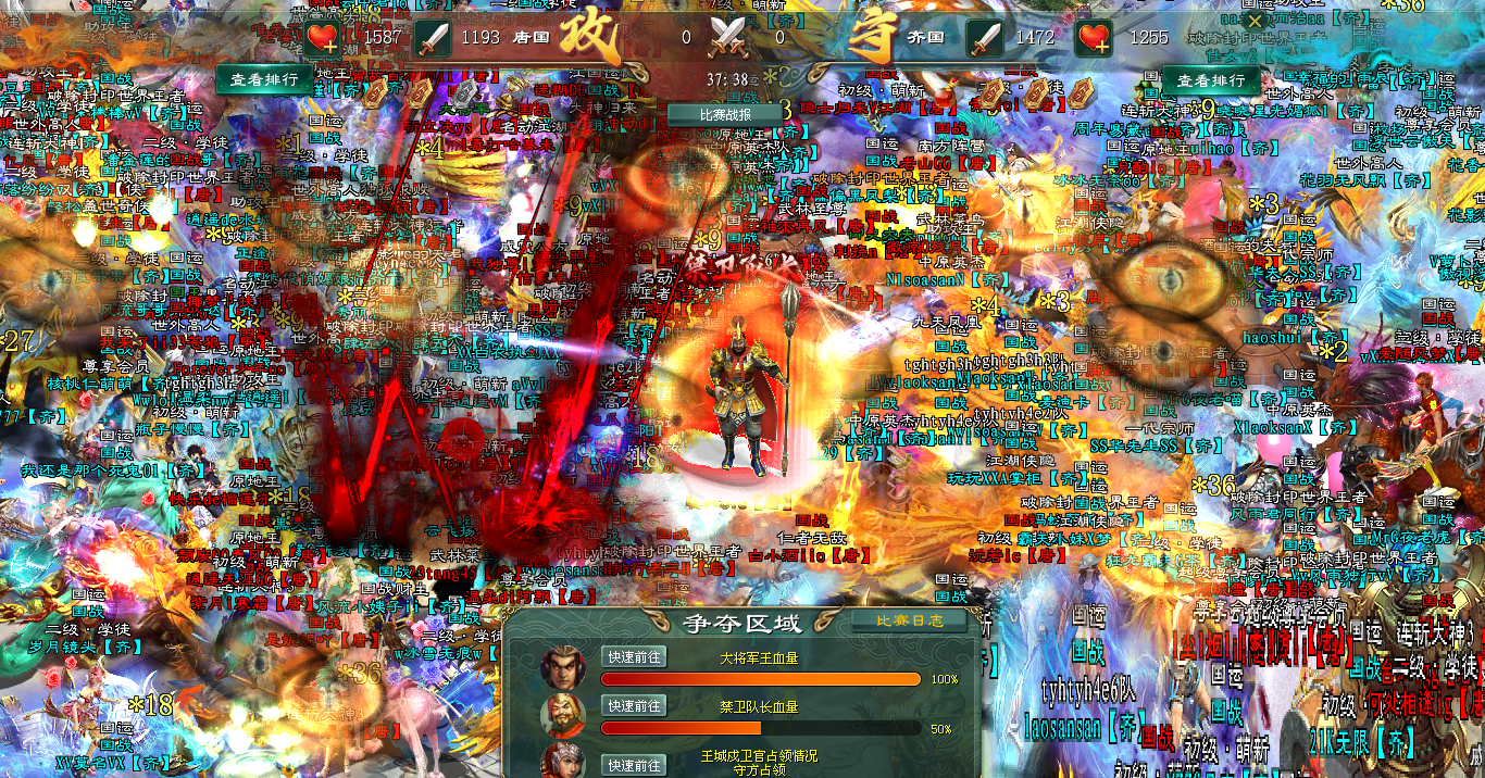 顷刻间,齐国援军从集结点奔袭而来,远远锁住唐军就开始扫射。密集的射击一度阻挡了唐军的攻势。但唐军攻势已然形成破竹之势,前面大号顶着箭雨撕开防御,后面法师和弓手锁住小将远程射击,发射群攻,火焰与冰霜,夹杂着利箭在小将身上炸开,小将血量接连减少。齐国将士拼死抵抗,硬生生的抵住唐军一波又一波的冲锋,可是仍然止不住小将血量的流失。十几分钟后,小将轰然倒塌,齐国第一道防线宣告失守。