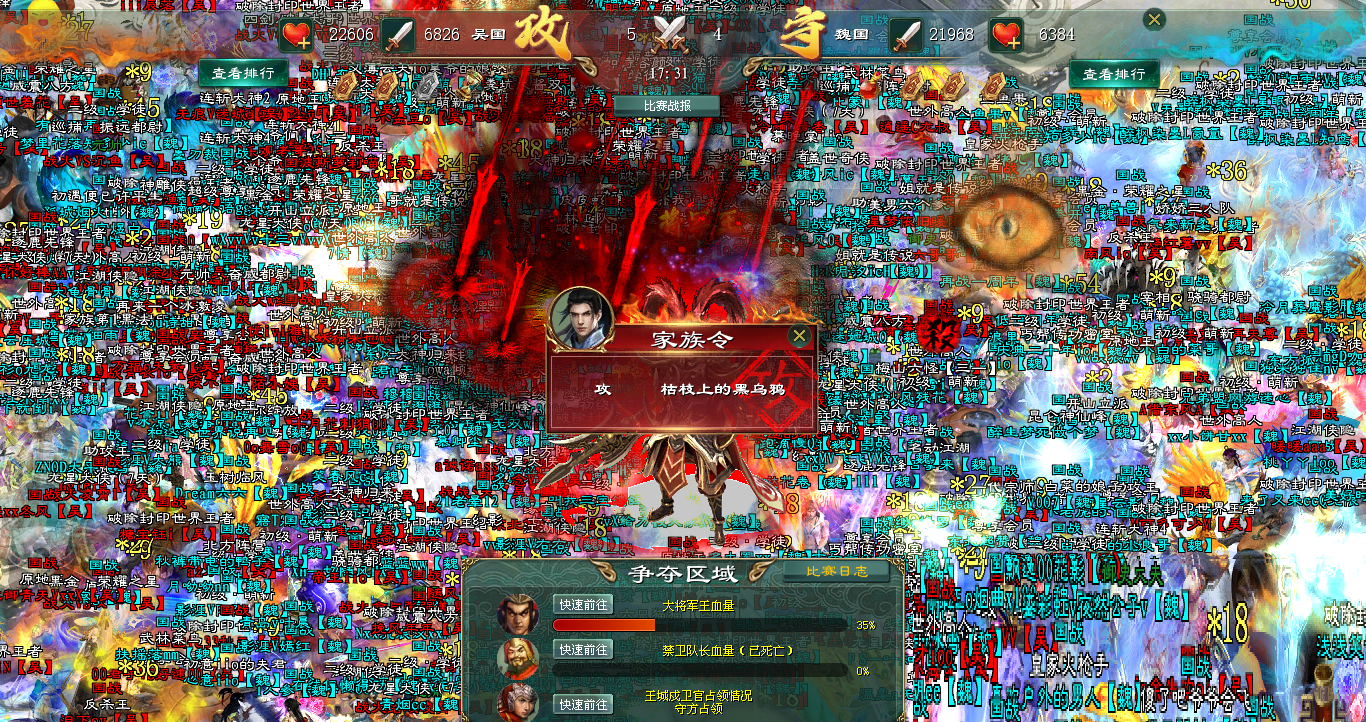 几分钟后大将的战斗进入白热化。吴国众家族令齐出,接令将士身影如林遮蔽天际,为全军注入澎湃的战力。将士们巧用隐身符原地突进,刀刀直取大将要害。魏国急忙调集精锐部队反扑,锋刃所及之处血肉横飞,却仍挡不住大将血量继续下跌。危急时刻,魏国大将发出求救令,所有兵力再度集结发起反击,吴国将士却斗志更盛,誓言要逼出魏国最后的加血手段。