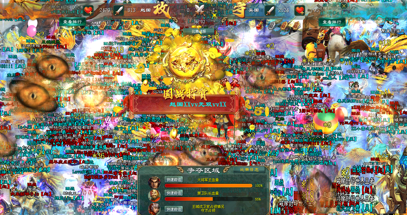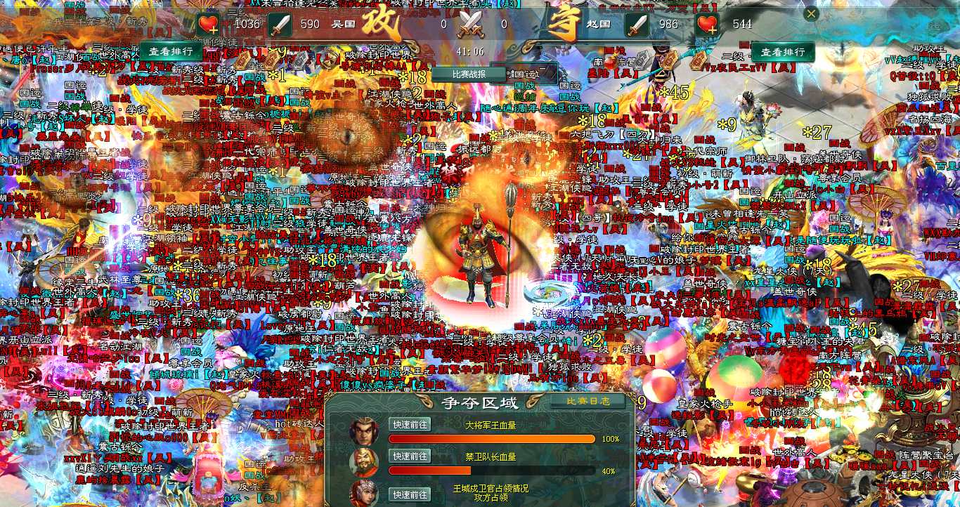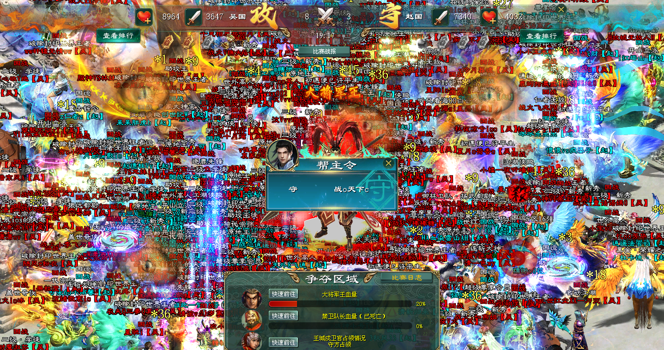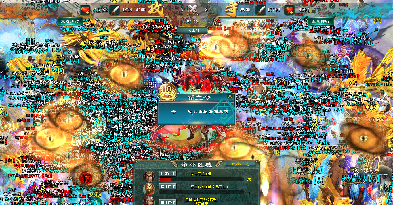 就在此刻,吴国国王令火速飞出,全国将士从四面八方驰援大将。一时间,大将周围人山人海,旌旗遮天蔽日,吴国守军似波涛般汹涌澎湃着,将大将围得水泄不通。赵国零星发出的家族令难以形成规模化攻势,只能靠着将士们的悍不畏死,在大将阵前近身拼杀,用一次次冲锋换取大将的点滴血量。