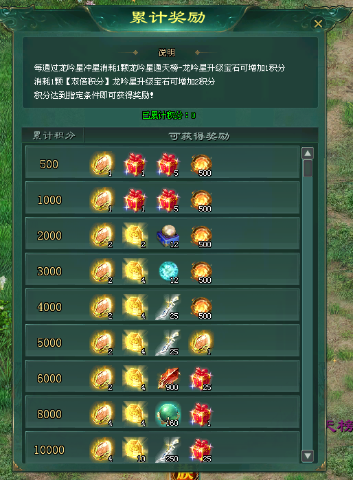 ·每通过龙吟星冲星消耗1颗通天榜·龙吟星升级宝石,可在龙吟星通天榜增加1积分;