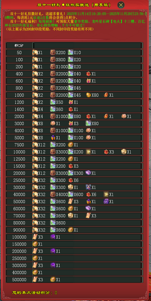 本期奖励新增百亿神石2025升级宝石、龙吟星【电火随机】13槽和龙吟星【火】13槽,助力快速养成!