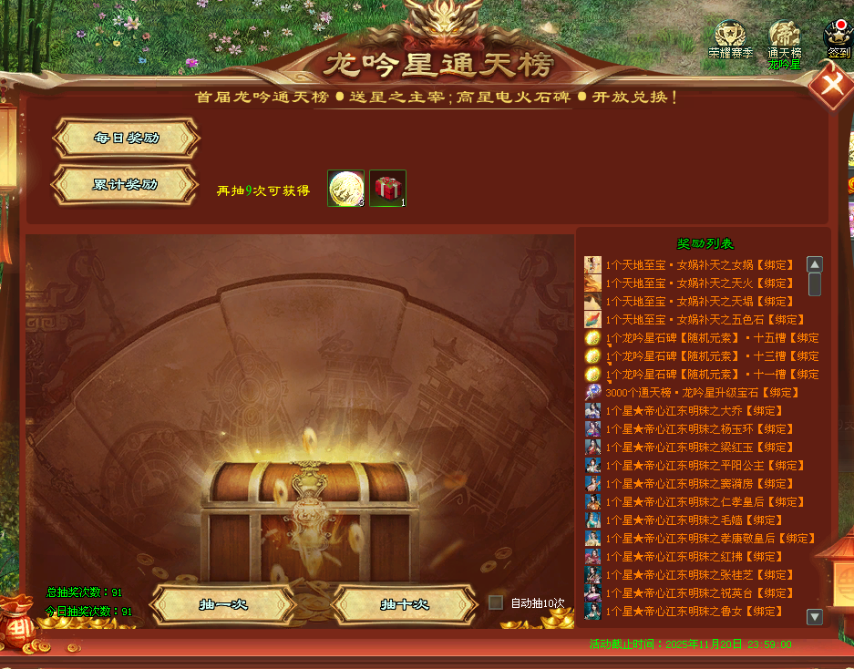 ·达到指定龙吟星通天榜积分即可获得双11·龙吟星锻造石,可获取高星龙吟星及石碑!