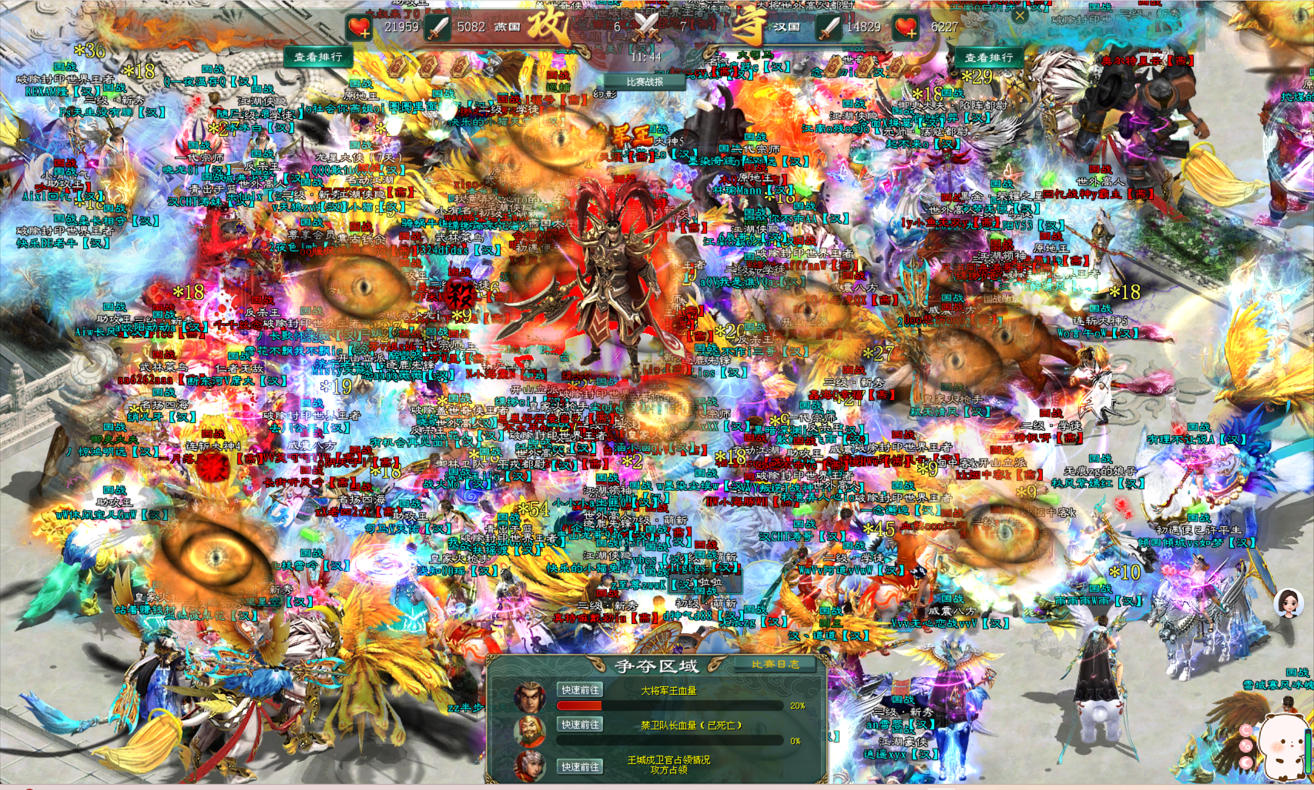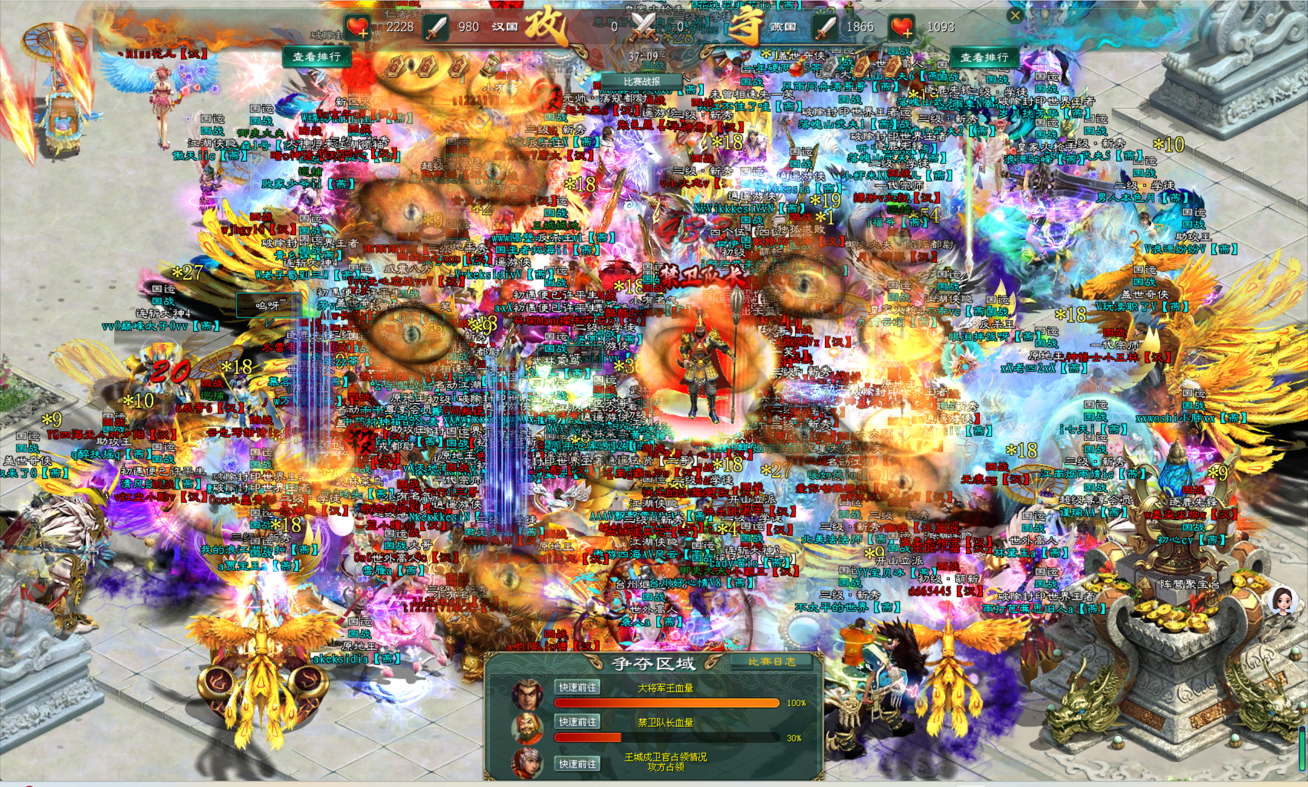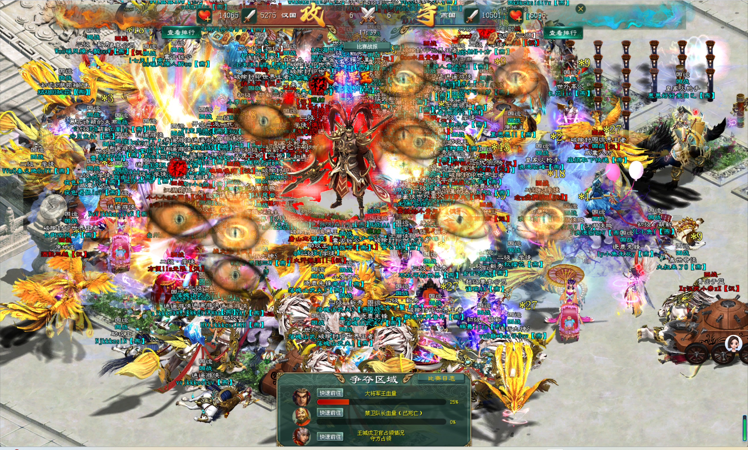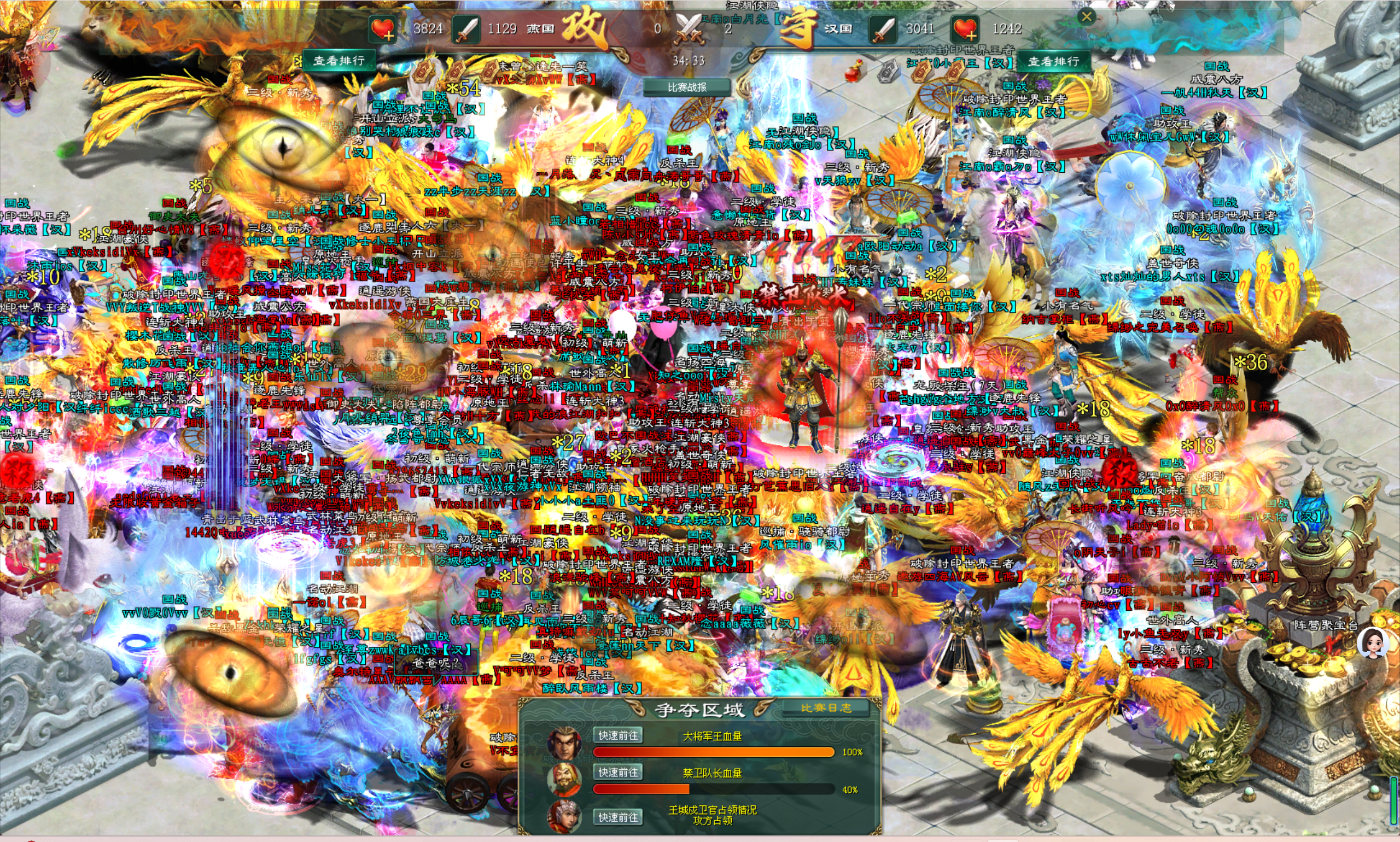 当国战开启时,南方阵营汉国所有参战的将士们剑指禁卫队长,所有人手中的武器全部牢牢锁定在了禁卫队长的身上。而防守的北方阵营燕国将士们则将南方阵营汉国将士团团包围,各种技能与大招不停地施放在那些正在攻击禁卫队长的南方阵营汉国将士身上。