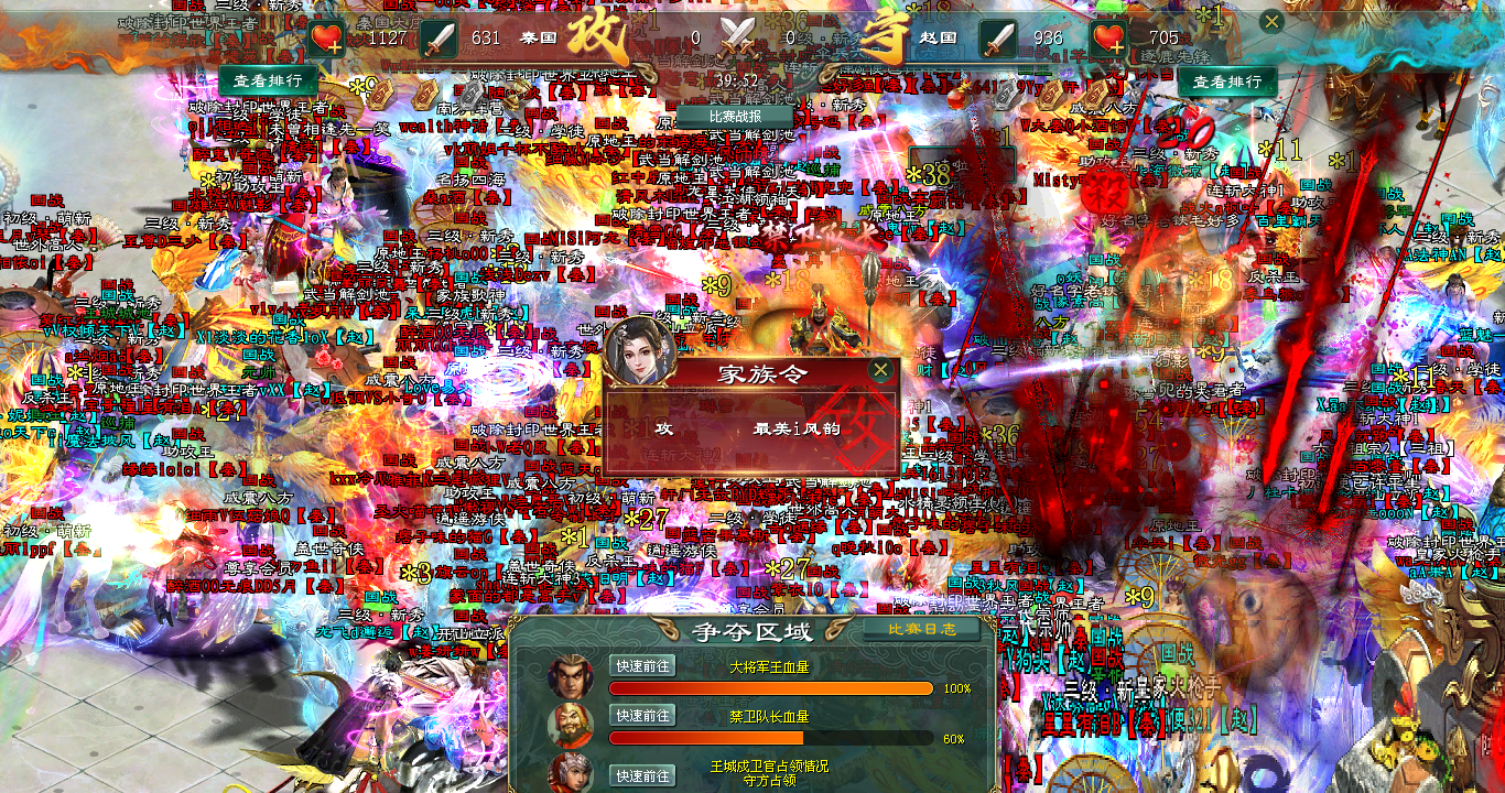 两军实力相当,力量在大将僵持,秦军拼死护卫大将,赵军猛攻不止,大将血量缓慢下滑。赵国咬牙再拉帮主令,秦军的家族令同一时间响应,将士们化整为零,合而歼之,围剿着赵军主力,激战再度升级。激昂的音乐响起,将士们眼中燃起嗜血光芒,技能大招连片迸发,黑龙波撕裂长空,耀眼的光亮爆炸在大将的身上,不断索取其血量。