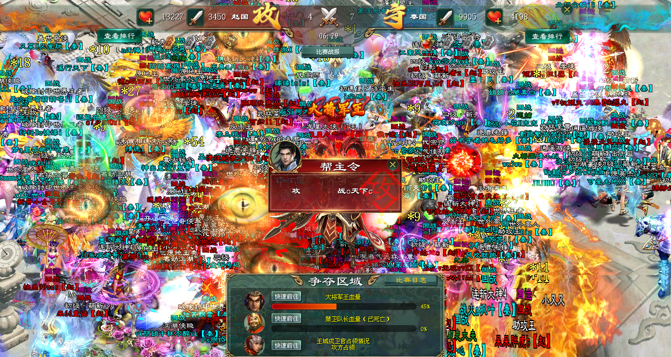大将发出求救令,秦国全国精锐火速驰援,“只杀大将脚下黑点!”秦军将士早将生死置之度外,用身躯筑起人墙!赵国再度拉出帮主令,秦国帮主令同步回击,双方将士落地扫群攻,技能碰撞的轰鸣震耳欲聋。赵国加时了,胜利的曙光就在眼前,将士们攻势更猛。秦军一看大事不妙,连忙给大将回血,并拉出国王令殊死一搏,奈何战力渐衰,大将血量持续告急。