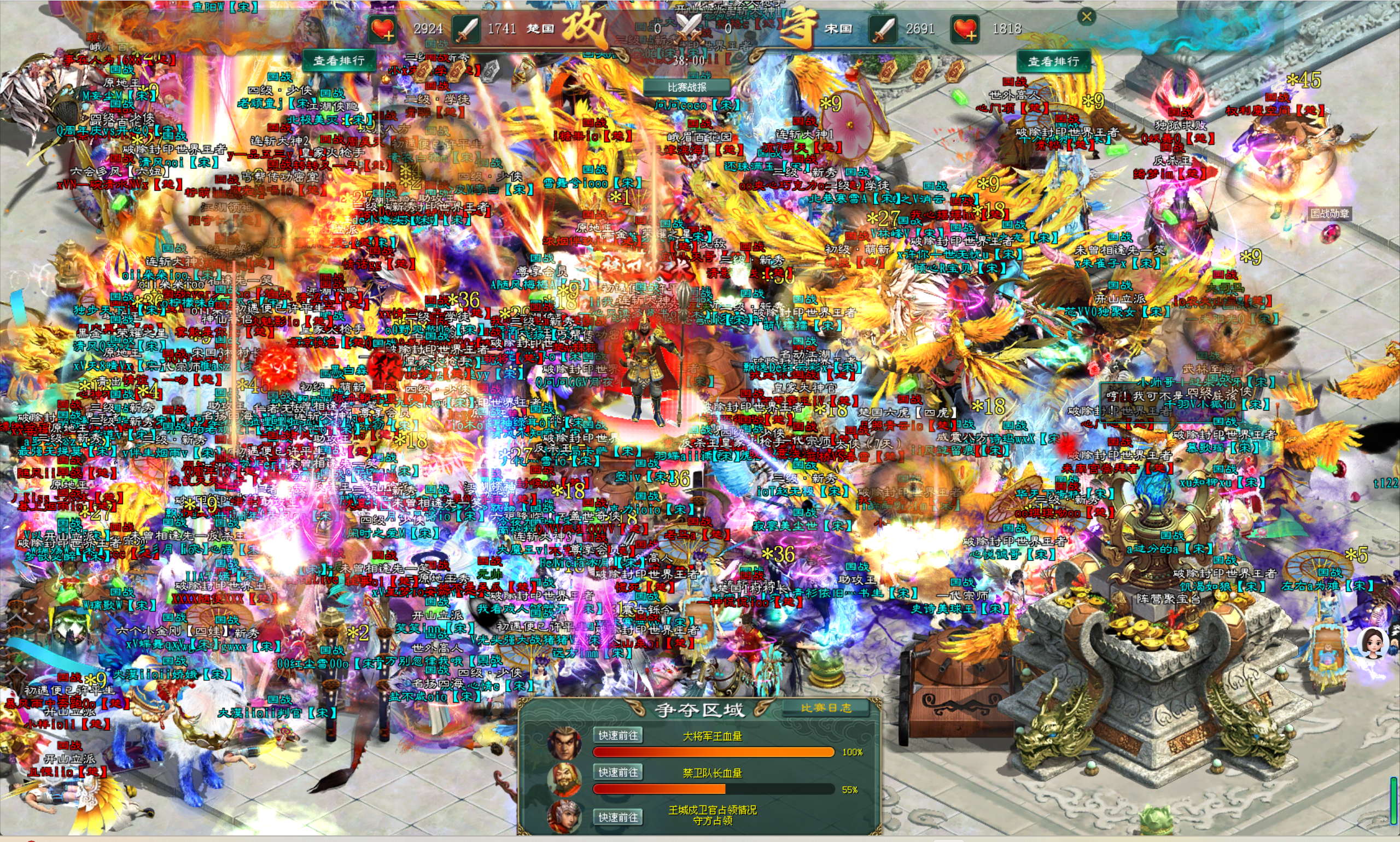 在一片混乱中,南方阵营宋国的将士们终于接近了禁卫队长。他们集中火力,向禁卫队长发起了猛烈的攻击。北方阵营楚国将士在一片喊杀声中顽强抵抗,但终究抵挡不住南方阵营宋国将士们的疯狂进攻,禁卫队长的血量逐渐减少。