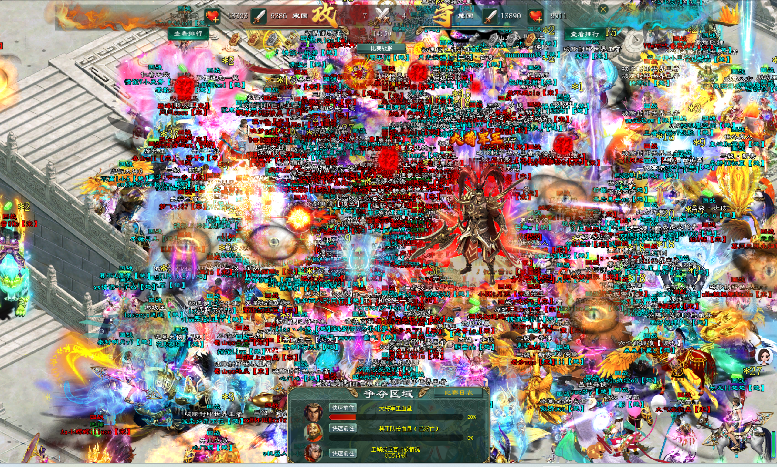 北方阵营楚国的正面进攻变得更加猛烈,他们抓住时机,集中力量向禁卫队长发起了最后的冲击。在北方阵营楚国将士们的全力攻击下,禁卫队长的血量逐渐减少。南方阵营宋国将士们心急如焚,他们拼尽最后一丝力气,想要保护禁卫队长。然而,北方阵营楚国将士们的攻势太过强大,最终,禁卫队长在一片喊杀声中倒下了。