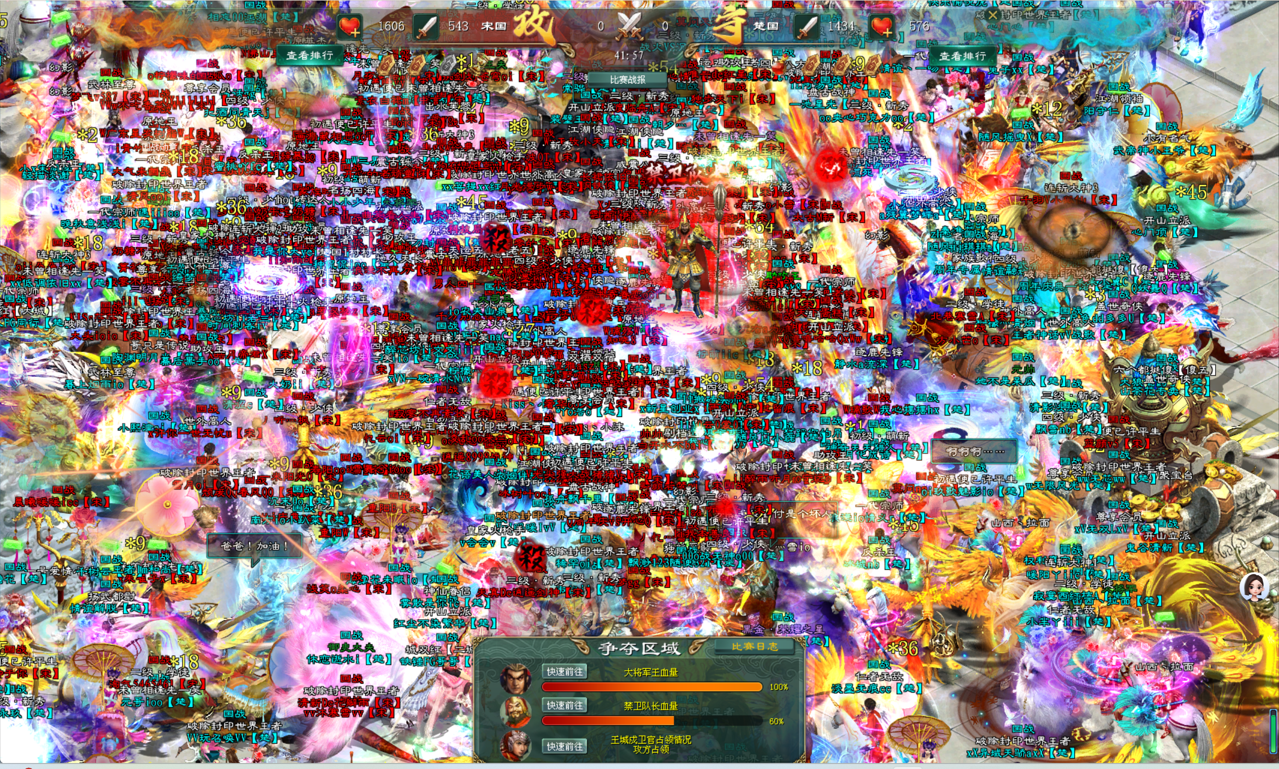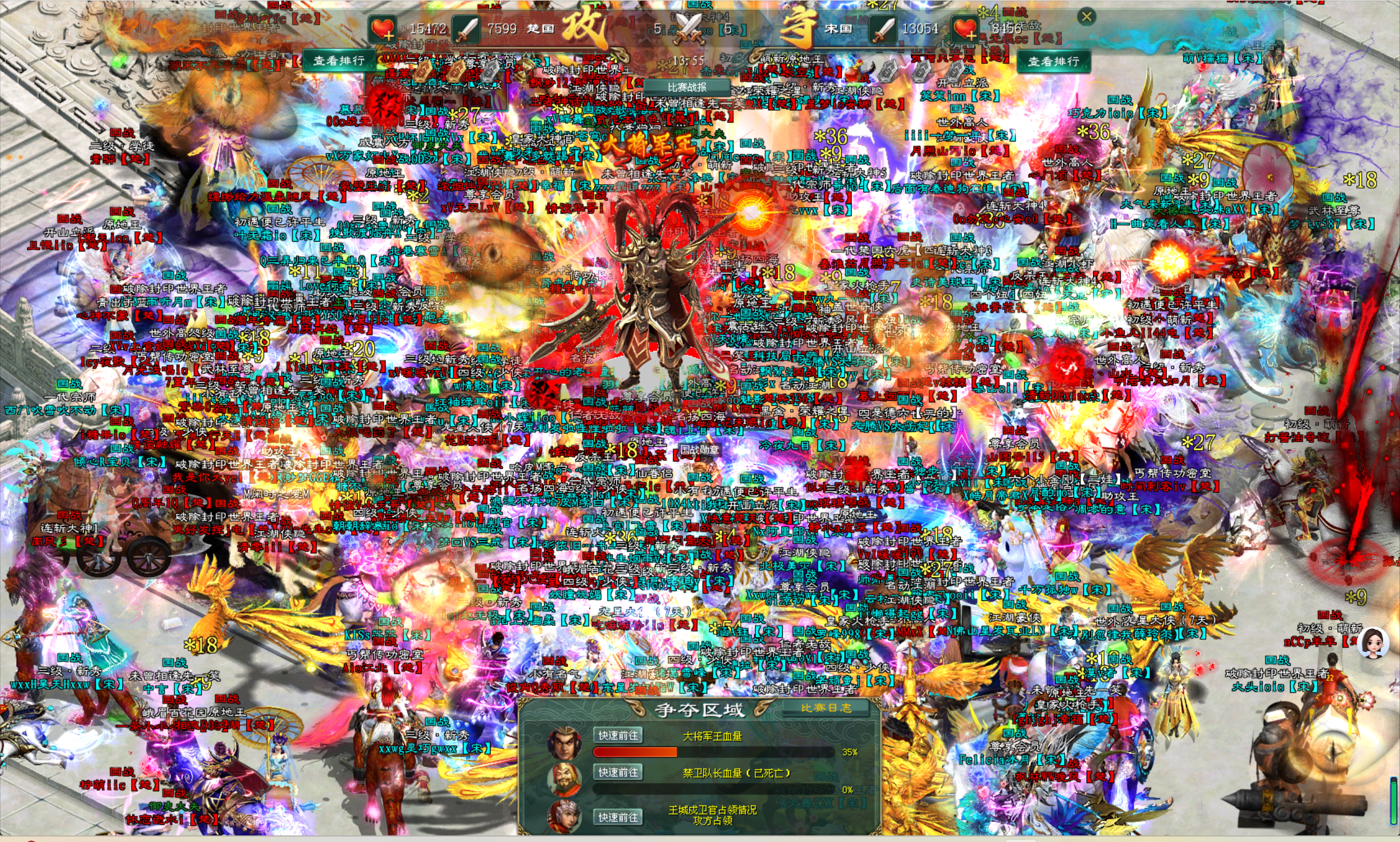 随着时间的推移,大将军王的血量也越来越少。北方阵营楚国的将士们看着大将军王血量不断减少,心中满是焦急与不甘。他们知道一旦大将军王倒下,这场国战就将以失败告终。于是,他们及时使用了加血技能,并爆发出了前所未有的力量,与南方阵营宋国的将士们展开了最后的殊死搏斗。