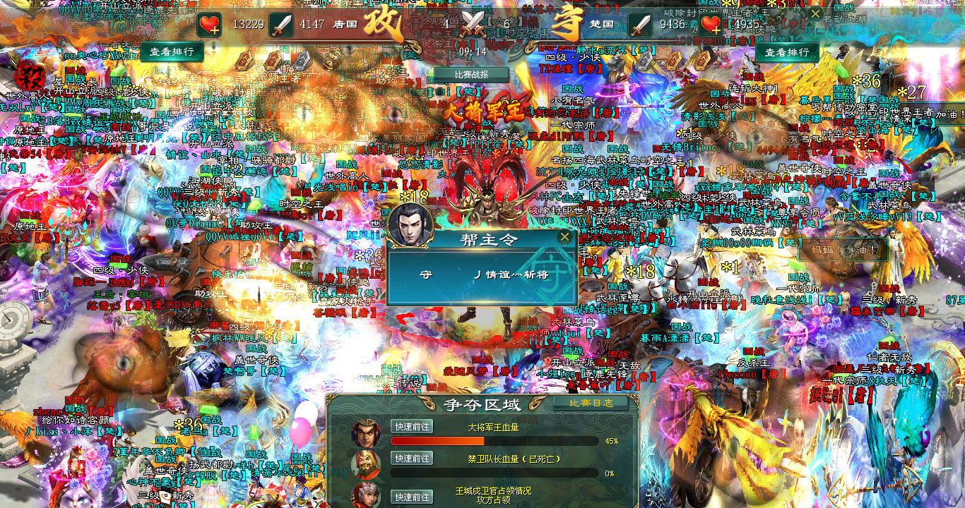 楚国的帮主令在台阶处骤然出现,守军迅速聚拢,凭借地形死守。但唐国将士根本不会放弃,也丝毫没有惧意,他们继续在大将脚下厮杀战斗。大将血量一路跌至半数,求救令骤然传遍战场,所有楚军火速支援,给溃散的防线注入新的生命力,令其迅速坚固起来。唐国必须加时了,否则他们难以取胜。国战时间的延长,让唐国将士有了获胜的底气。