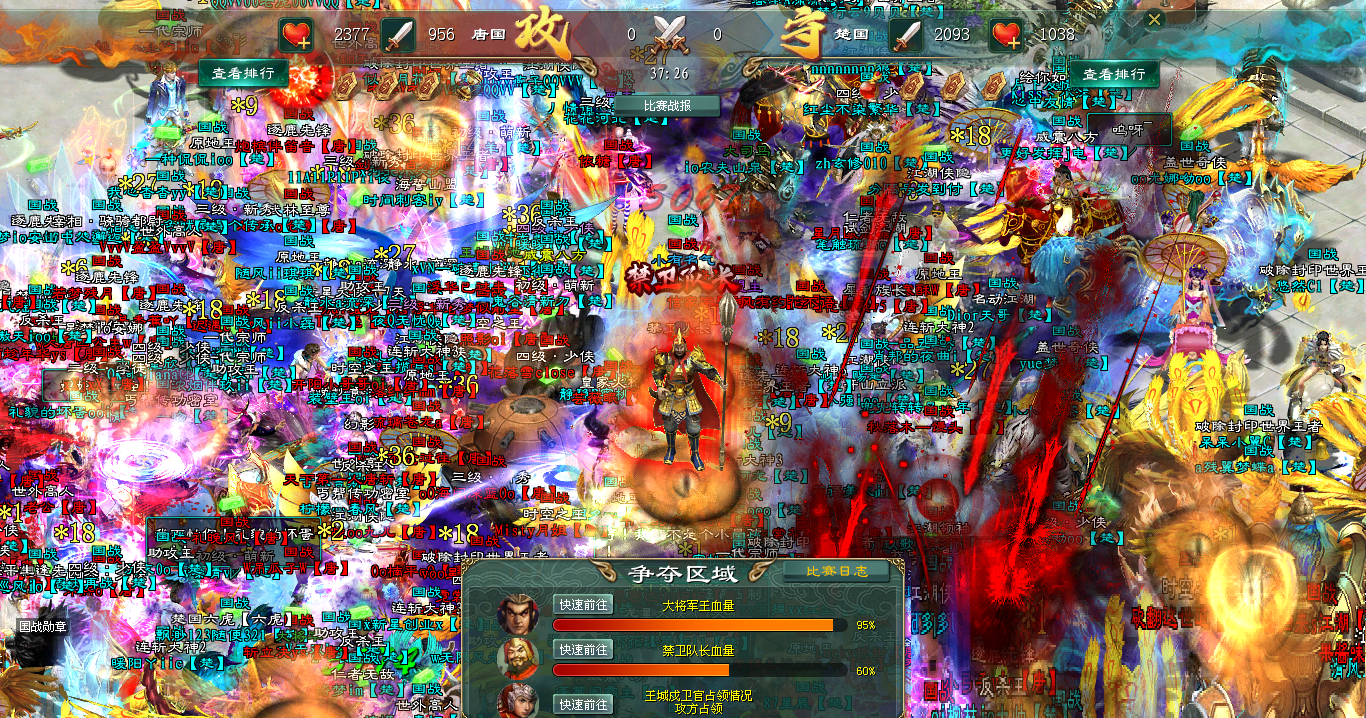 楚国来不及休整,立刻对大将发起进攻。唐国率先拉出大令,绿色令牌发出尖锐的响声,召集唐国各将士速来作战。几乎同时,楚国家族令紧随其后,两方令牌在空中交织碰撞,预示着两方阵营激烈的战斗。两国精锐尽数向大将集结,一场更为激烈的厮杀正式上演。唐国将士开启火力压制,无数大招如流星赶月般砸向楚军队形,火球、雷电、冰锥,箭矢交织在一起,楚军将士成片成片的倒下,却依旧无人退缩。