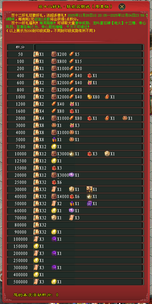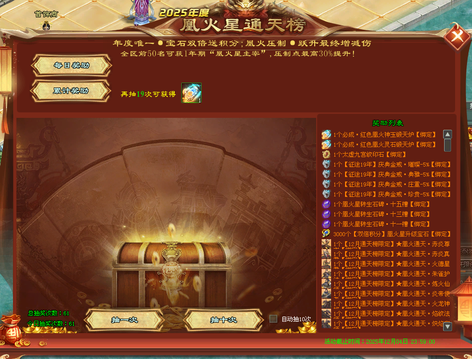本期奖励新增百亿神石2025升级宝石、龙吟星【电火随机】13槽和龙吟星【火】13槽,助力快速养成!