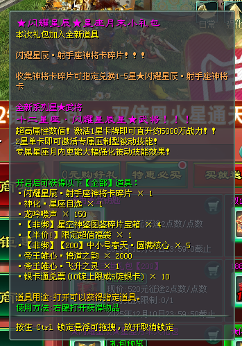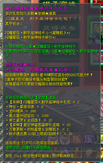 礼包内含闪耀星辰·射手座神将卡礼包,获得全新系列十二星座星武将神将卡。随包还可以获得射手座攻防祝福buff、射手座压制祝福buff!