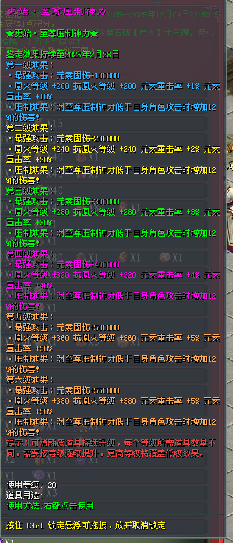 “更始·至尊压制神力”BUFF,最高可获数十万元素固伤加成,攻击至尊压制神力BUFF低于自身的角色时,增加伤害!