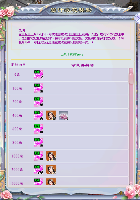 花榜历史坐骑自选(五选一),收/送20000朵花可获得;