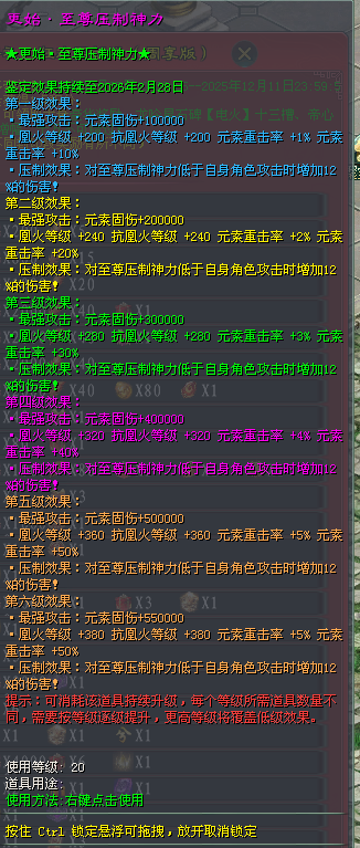 “更始·至尊压制神力”BUFF,最高可获数十万元素固伤加成,攻击至尊压制神力BUFF低于自身的角色时,增加伤害!
