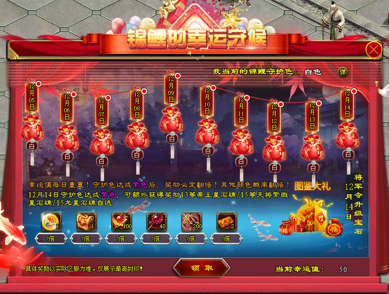 12月14日,守护色达到紫色,领取奖励时可获得额外奖励:13等帝王星/15等紫微星/15等龙星石碑自选!