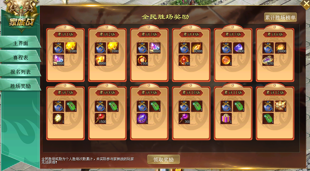 ·比赛奖励:全民参与瓜分银子,参赛所有区服中助力赛胜场场次达到7胜以上家族成员共同瓜分88888锭非绑银!每个胜场均可获得对应胜场奖励,赢取大量巅峰阵营助力币,兑换珍稀奖励!
