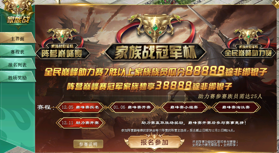·参与方式:12月5日开启报名后,各家族族长可在赛事界面中报名参赛,并由阵营主选派家族代表本阵营参赛,每个赛区各有32支家族队参赛,采取跨区家族战形式角逐冠军;