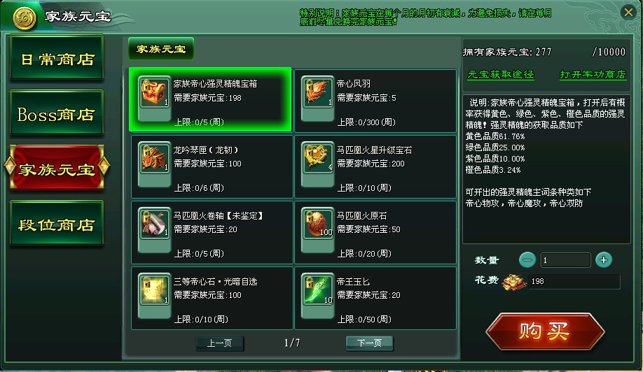 家族元宝商店:新增马匹凰火原石、马匹凰火星升级宝石,帝心石·光/暗升级为3等自选;