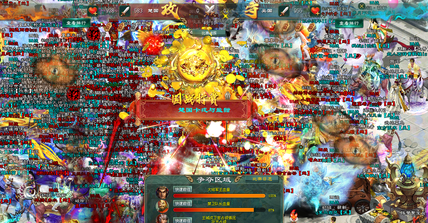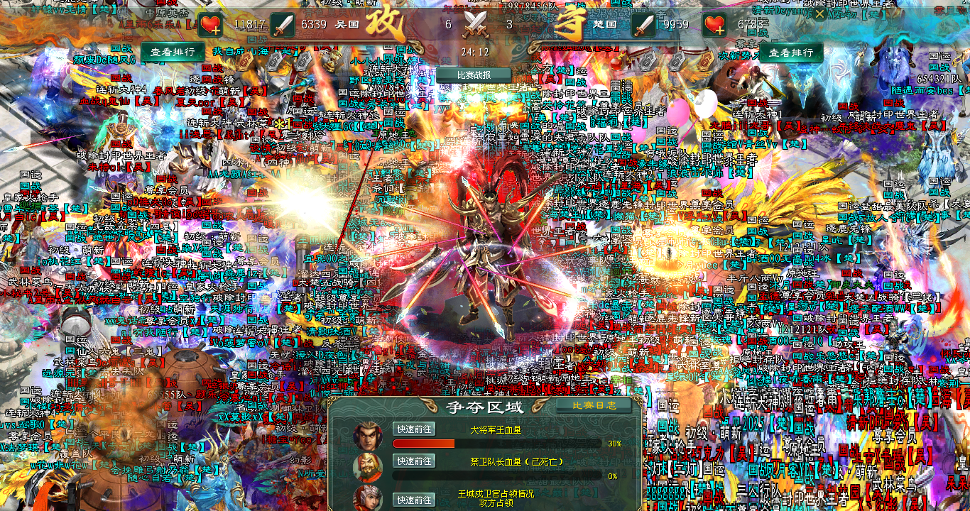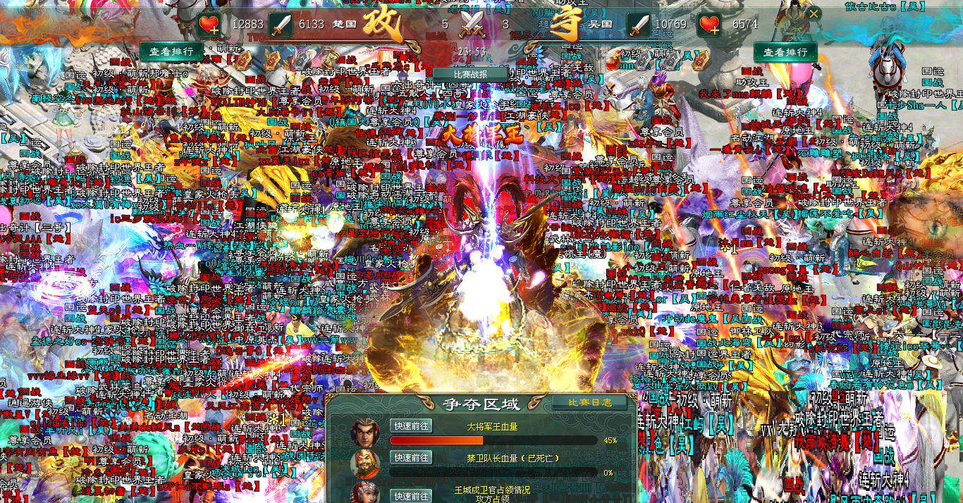 吴国岂能坐以待毙,嘟嘟频道里传出仓促的急吼:“全体集结,死守小将!”吴国将士迅速回防,在小将周围筑起铜墙铁壁。两国大军瞬间碰撞,如两座大陆板块相撞,爆发出惊天动地的响声。刀光剑影交错,炮弹流火相击,炫彩的技能特效炸裂全屏。战士负责在前冲锋,法师和弓手则在远程精准射击!吴国将士凭借地形优势顽强抵抗,楚国则靠着人数压制疯狂猛攻,小将的血量在两军的厮杀中开始下降。经过几分钟的惨烈拼杀,楚国付出了巨大的代价,而吴国的小将也被击杀在地。