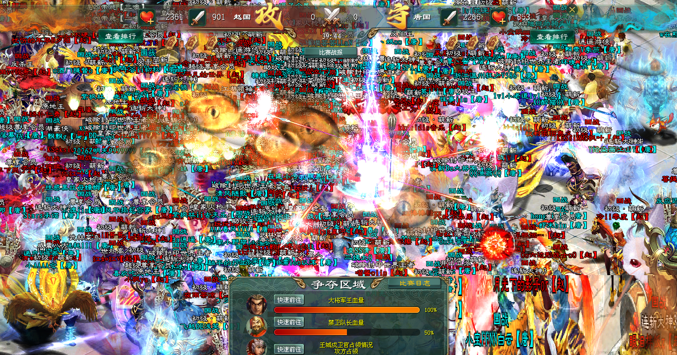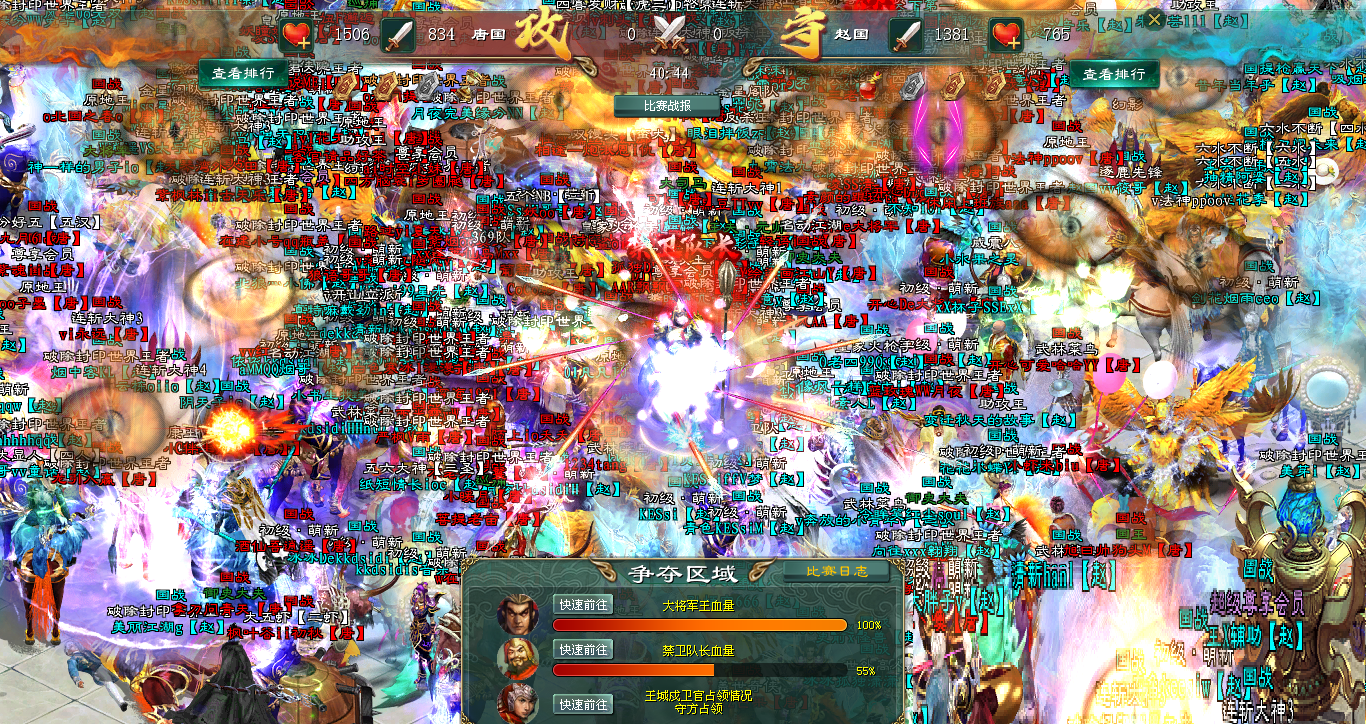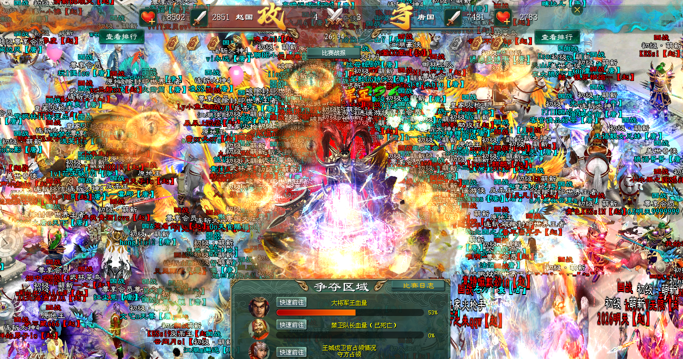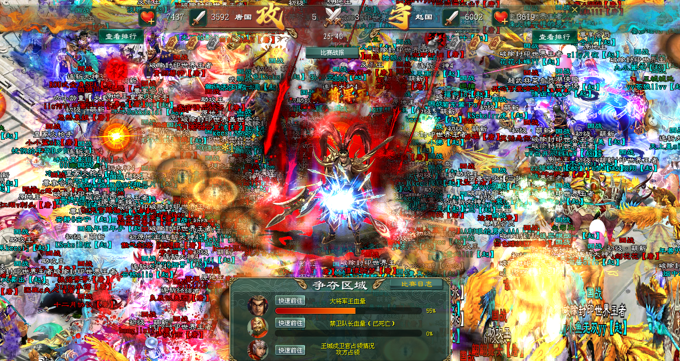 赵国的攻势堪称摧枯拉朽,将士们一个横扫千军就清空一片敌人,法师、弓手、轮子、道士等职业发射的特效漫天飞舞,覆盖了整个战场。唐国将士拼死抵抗,原地战斗,但面对赵国的压倒性火力,终究难以支撑,大将的血量以肉眼可见的速度下降。眼看防线即将崩溃,唐国只能使用加血,一道巨大的绿色回血迅速笼罩大将,血量暂时得到小幅回升。