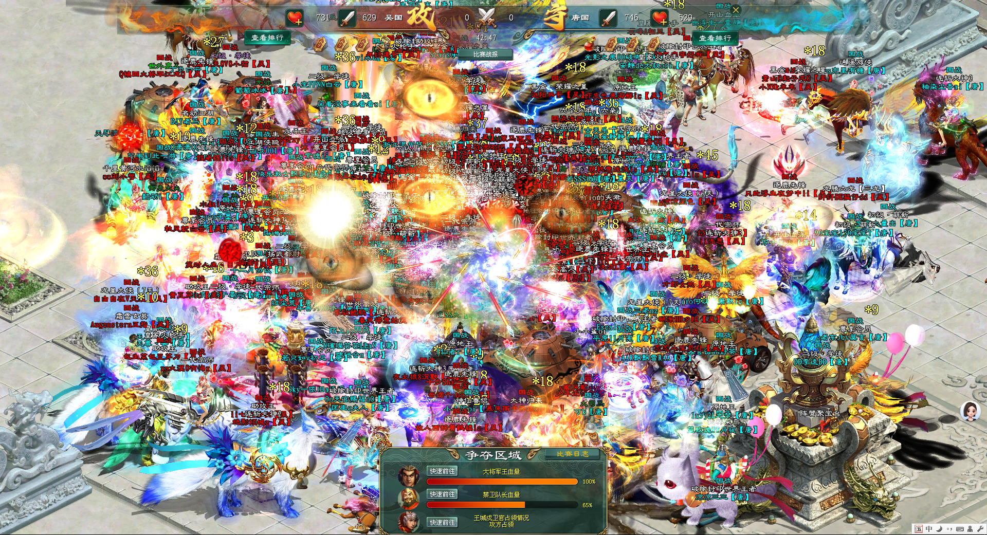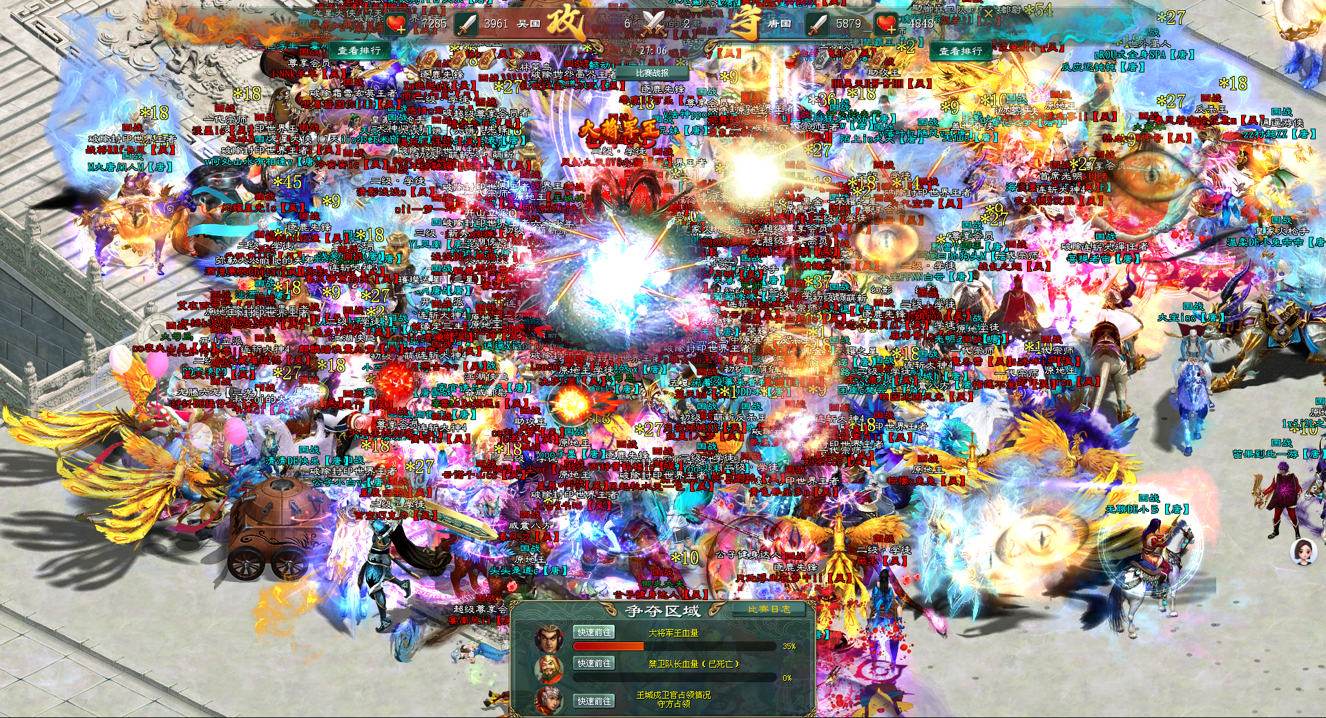 所有参战的吴国将士们团团包围住大将军王,不停地向着大将军王施放着各种技能与大招,大将军王的血量下降的速度很快。唐国将士则在大将军王周围筑起坚固防线,前排的战士顶着吴国的猛烈输出,后方的弓箭手与法师不断释放范围技能,试图分割吴国的进攻阵型。