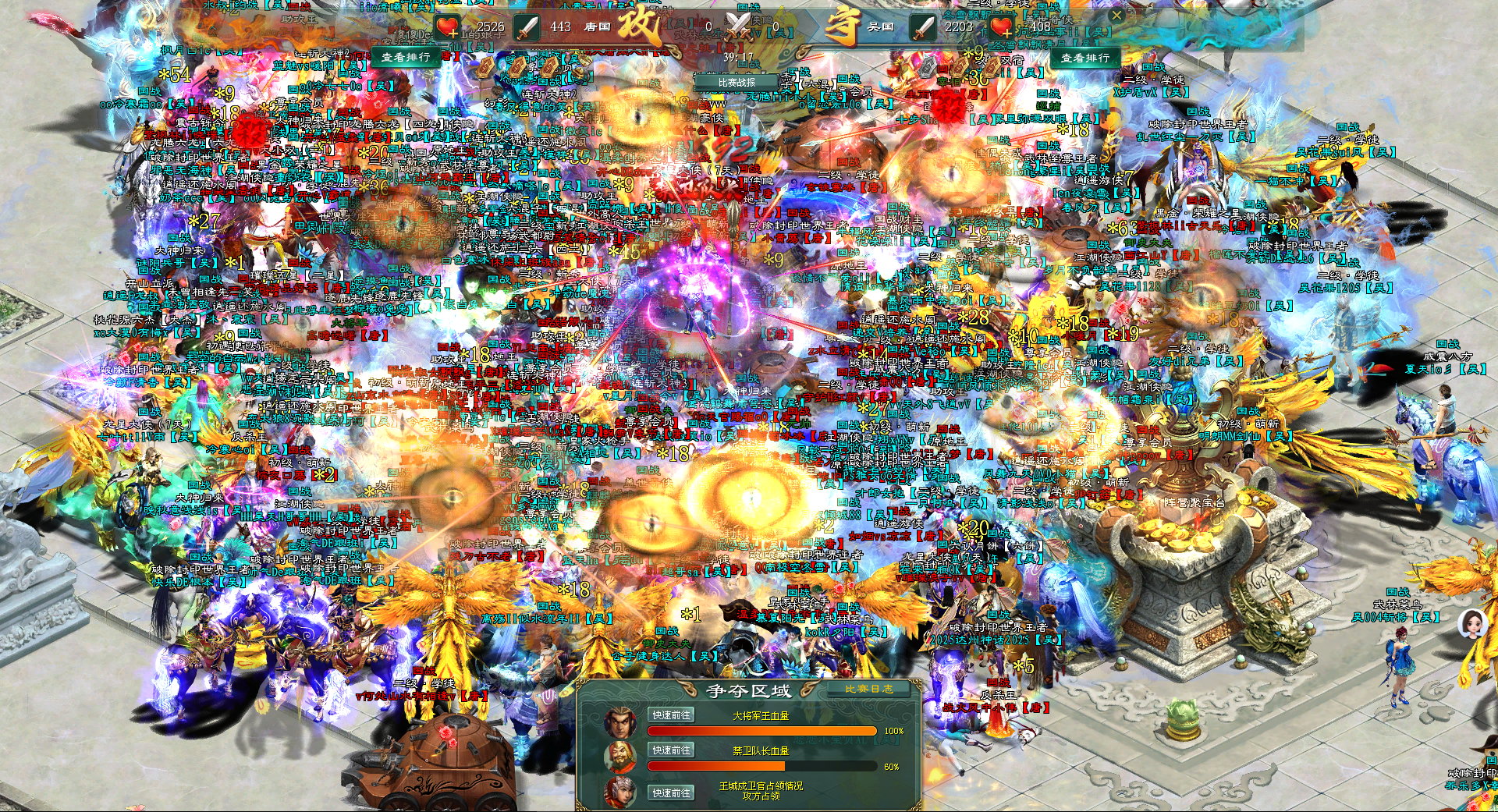 时间一分一秒地流逝,大将军王的血量逐渐逼近危险线。唐国将士们深知时间的宝贵,他们加大了输出力度,各种终极技能在战场上空轮番上演,绚丽的光影背后是毁灭性的伤害。吴国的防线在唐国持续而猛烈的攻势下,开始出现松动,大将军王的血量依旧如同风中残烛。